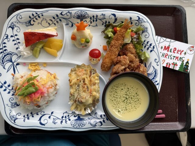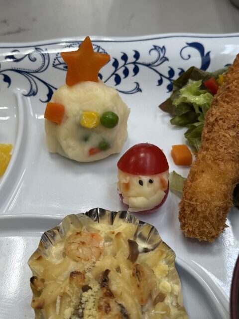私のおすすめは厨房さんが1つずつ丁寧に作って下さってる、ポテトサラダのクリスマスツリーとトマトの可愛いサンタさんです❤️毎日栄養的で美味しい昼食を作って下さっている厨房の職員に直接お礼を伝えることができました😊