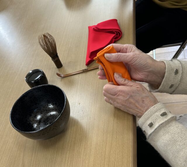 4月からスタートしたこのサークルでは、これまで簡単な「帛紗(ふくさ)」の扱いを学んできました。