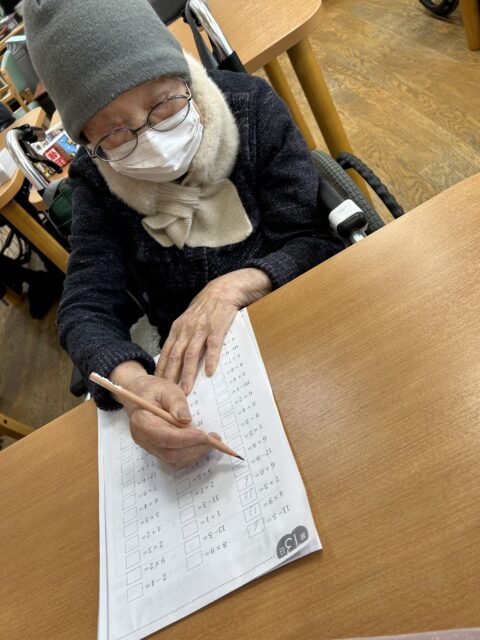 脳トレの計算問題もスラスラと解いてしまわれます。間違いがないかを何度も確認されてから、職員に「できました~」と提出される丁寧な一面も(⌒∇⌒)